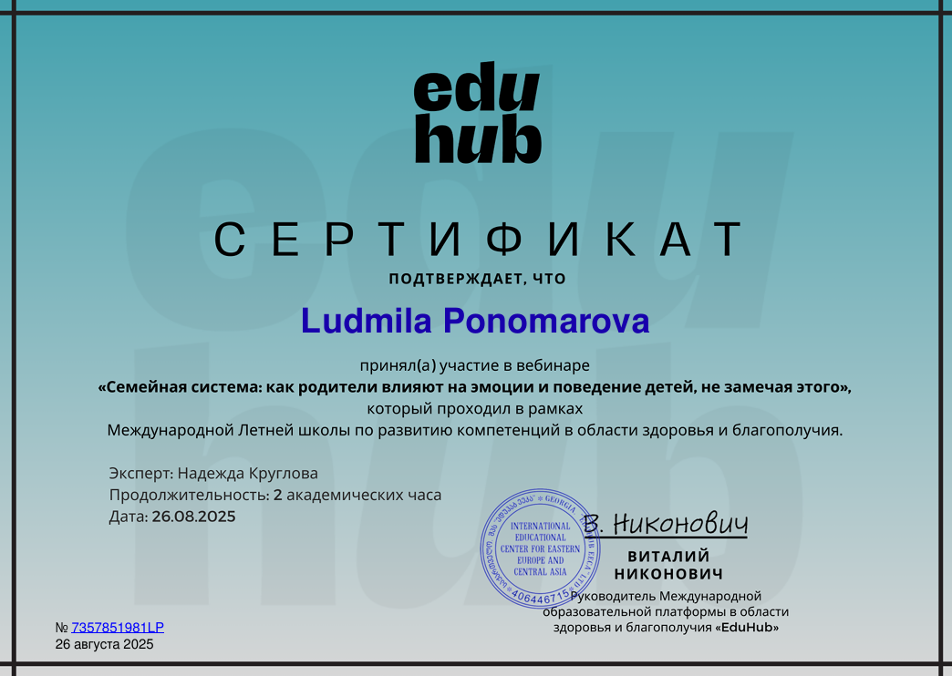 100/10. На каждом сеансе чувствуется забота и поддержка. Кроме помощи в осознании своих эмоций, Людмила помогает найти комфортное решение для многих проблем. Благодаря нашему взаимодействию я научилась лучше понимать себя и свои страхи. Рекомендую всем, кто ищет компетентного и внимательного специалиста!