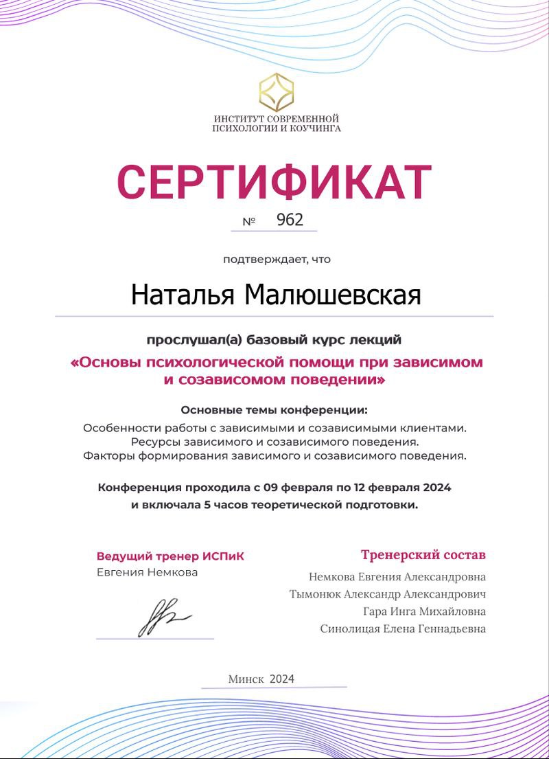Был на консультации у Натальи. Мне понравился ее деликатный подход и наводящие вопросы, которые позволили мне посмотреть на мои проблемы с новой точки зрения. Наталья, очевидно, очень хороший специалист, если за столь короткое время смогла не только выявить мои "болевые точки", но и дать разумные советы, чтобы, если не удалить, то хотя бы смягчить их. Большое спасибо Наталье за профессиональную помощь.