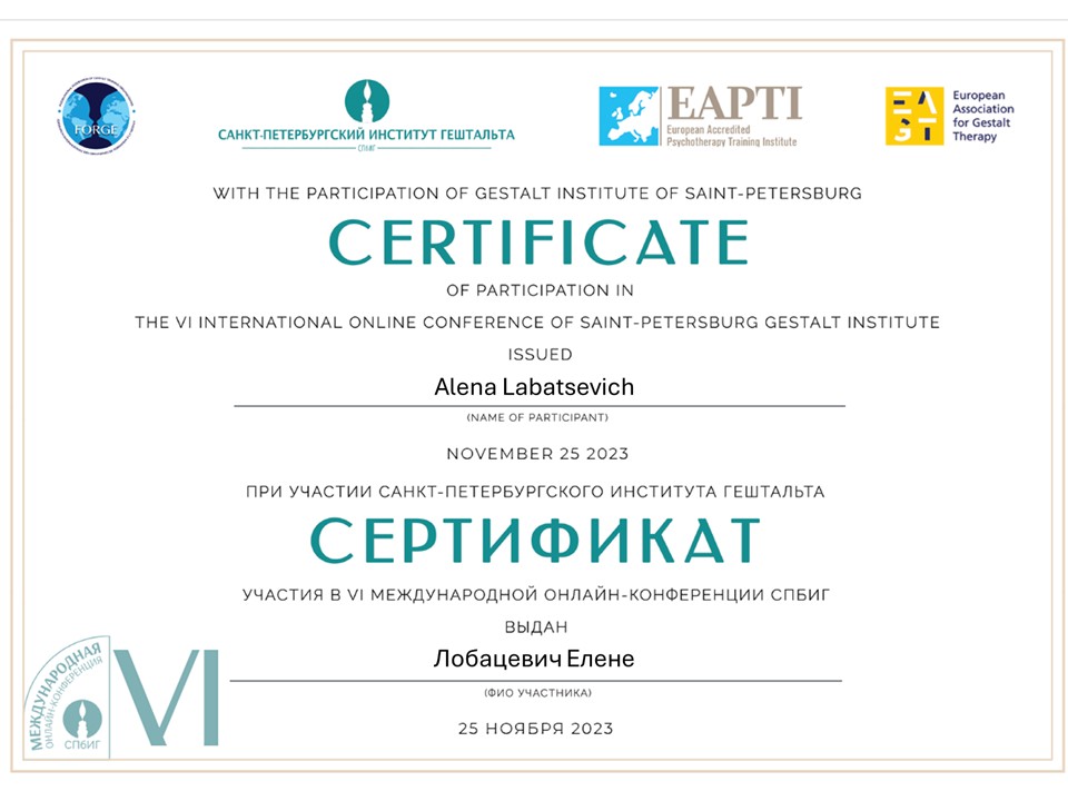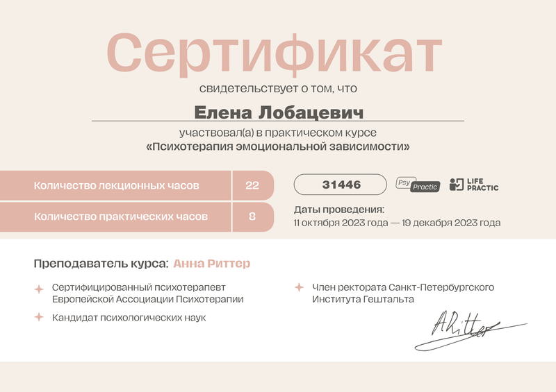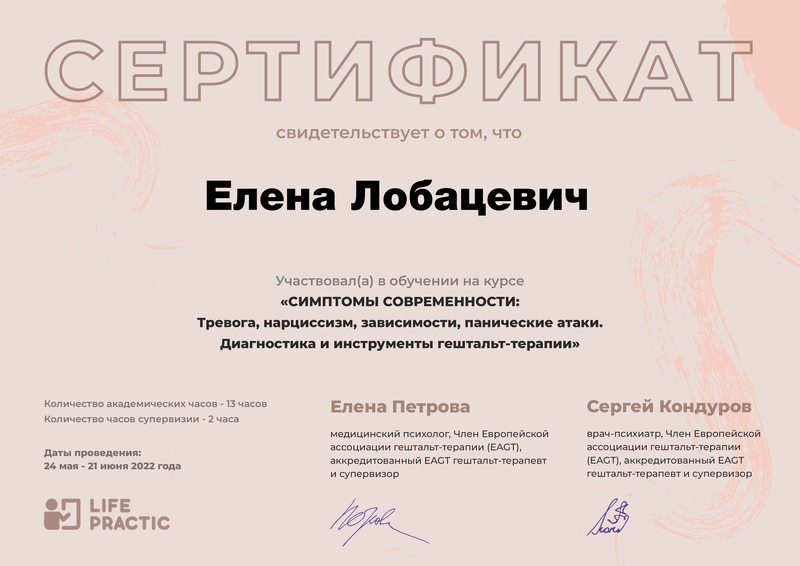 Я — сертифицированный гештальт-терапевт и врач-психиатр. Моя специализация — гештальт-терапия в клинической практике и организационном консультировании. Такой опыт помогает работать как с внутренними кризисами, тревогой и выгоранием, так и с трудностями, связанными с отношениями, карьерой или стрессом в работе.