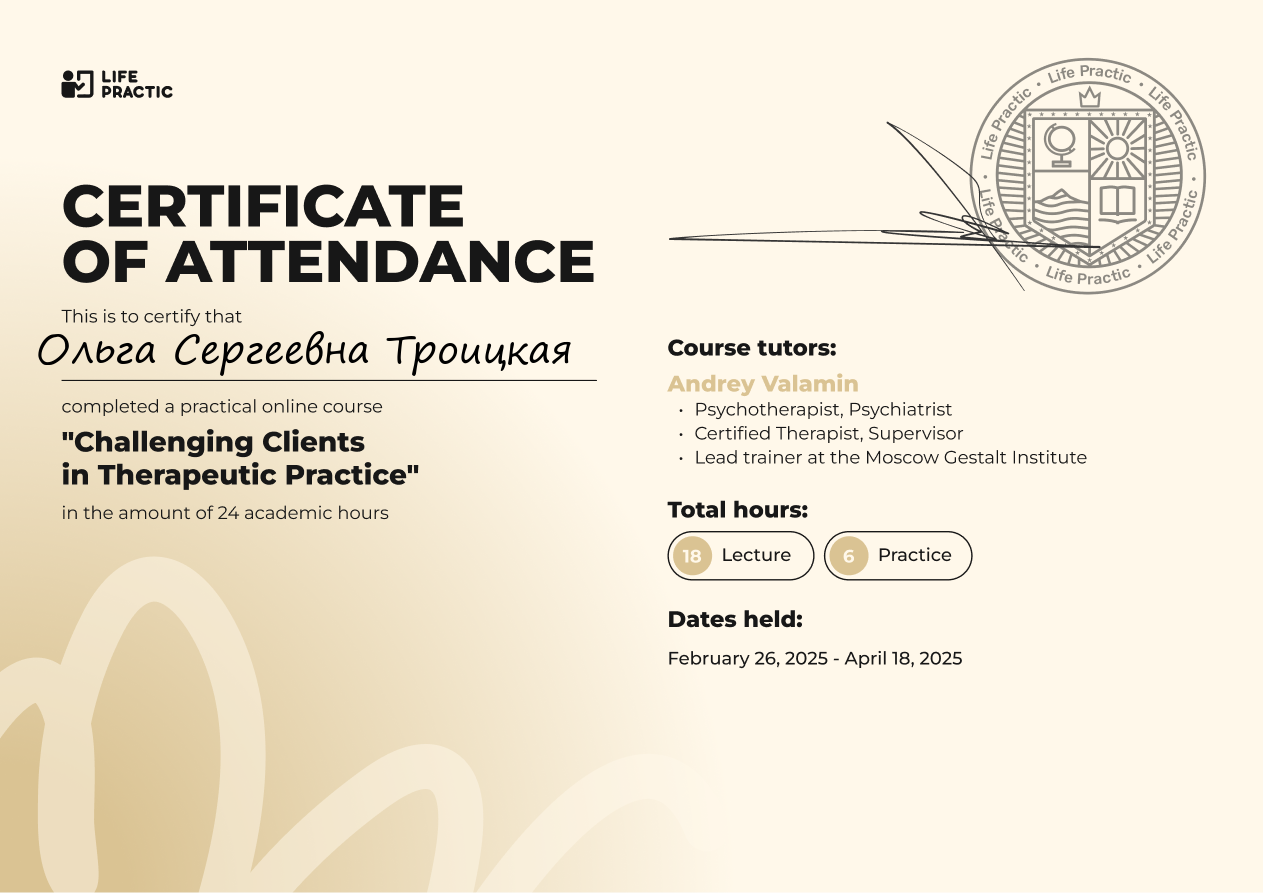 Это была 4 или 5 консультация со специалистом, мы разобрали одну из глубоких тем, которая меня беспокоит и вызывает тревогу. Ольга погружается в вашу проблему и старается следовать научным техникам, правилам, чтоб вывести вас к нужному результату а не просто обсудить вашу проблему. Если у вас есть проблема которая мучает вас годами, то настоятельно рекомендую обратиться к данному специалисту.