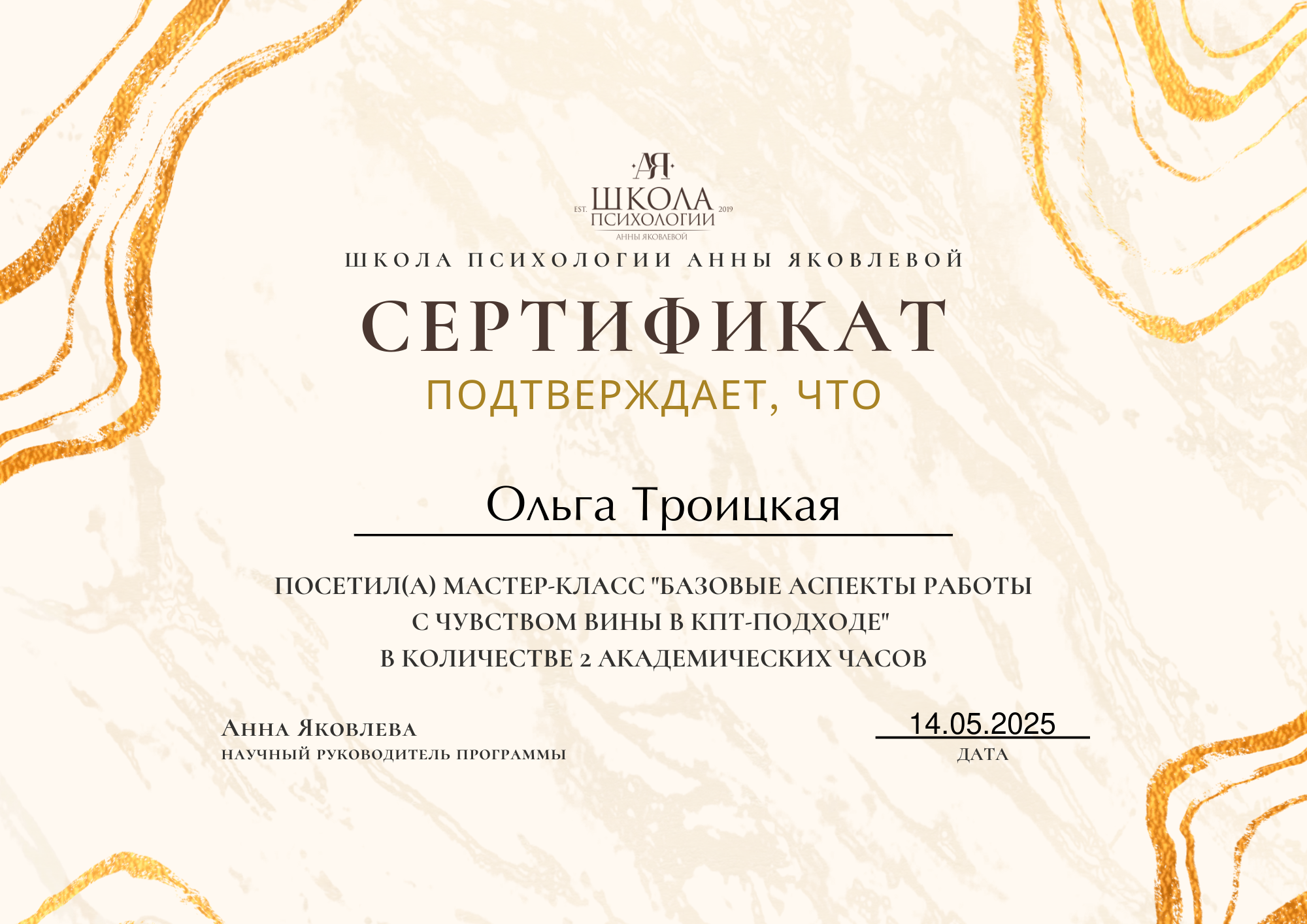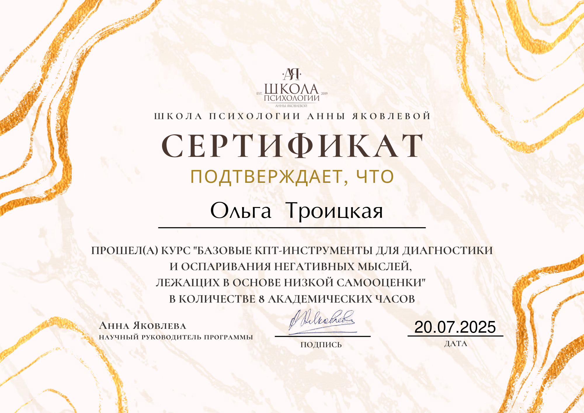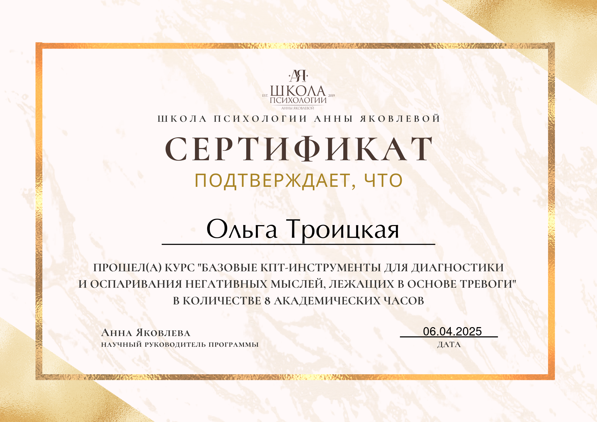 Основной подход — когнитивно-поведенческая терапия (КПТ), научно обоснованный метод, который доказал свою эффективность при работе с тревожными состояниями, депрессией и другими расстройствами. Я обучалась по программе Бостонского университета, специализируясь на тревожных и депрессивных расстройствах, а также в психологической школе Анны Яковлевой.