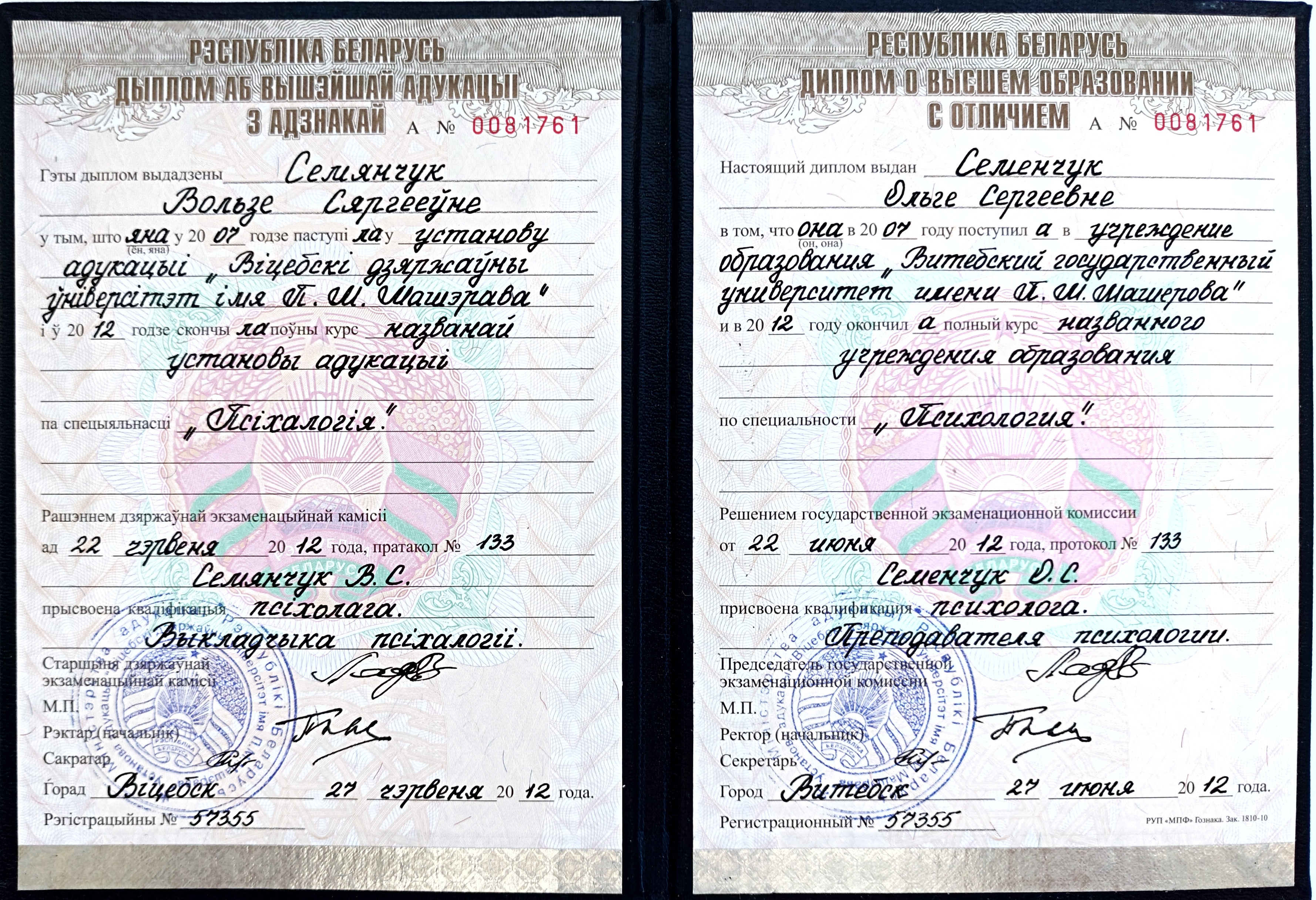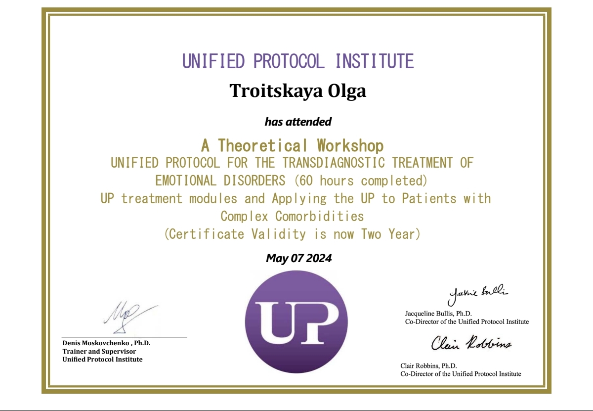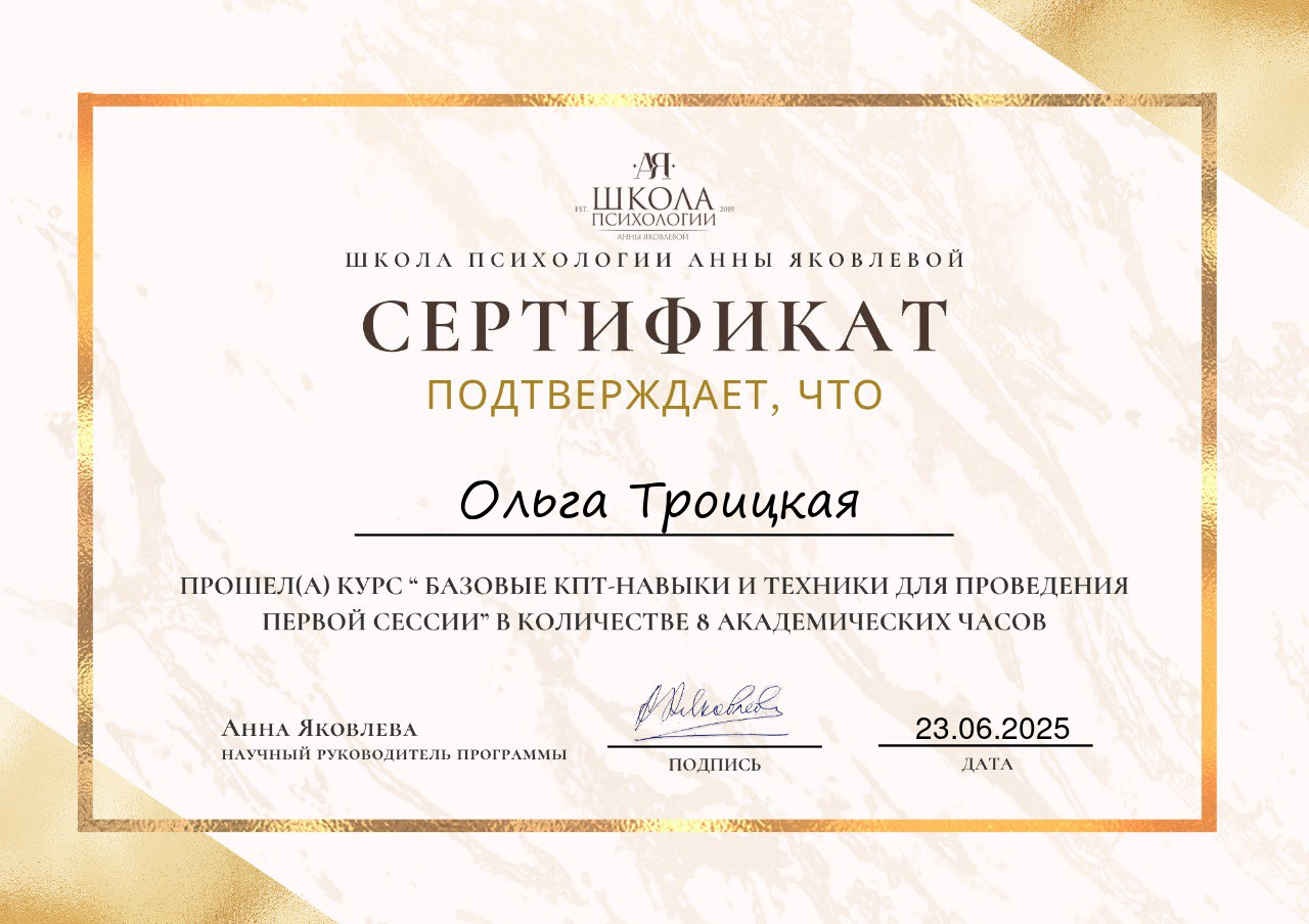 Основной подход — когнитивно-поведенческая терапия (КПТ), научно обоснованный метод, который доказал свою эффективность при работе с тревожными состояниями, депрессией и другими расстройствами. Я обучалась по программе Бостонского университета, специализируясь на тревожных и депрессивных расстройствах, а также в психологической школе Анны Яковлевой.