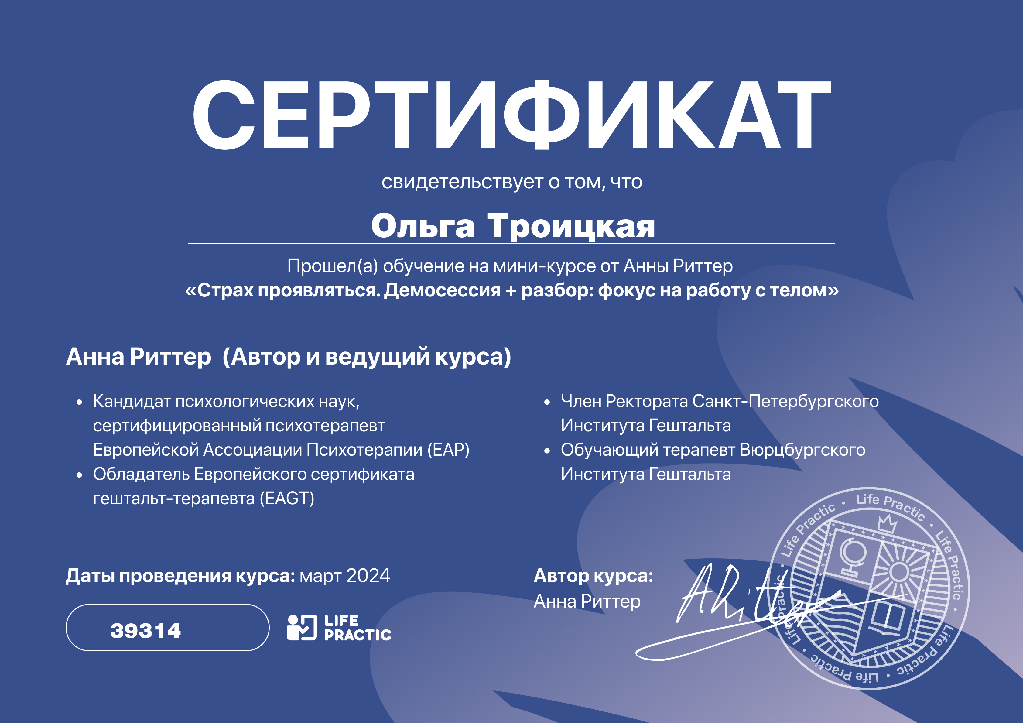 Первый сеанс оставляет сразу же положительное впечатление, спасибо Ольге, сразу располагает к себе и хочется открыться
