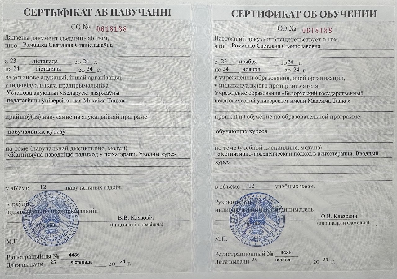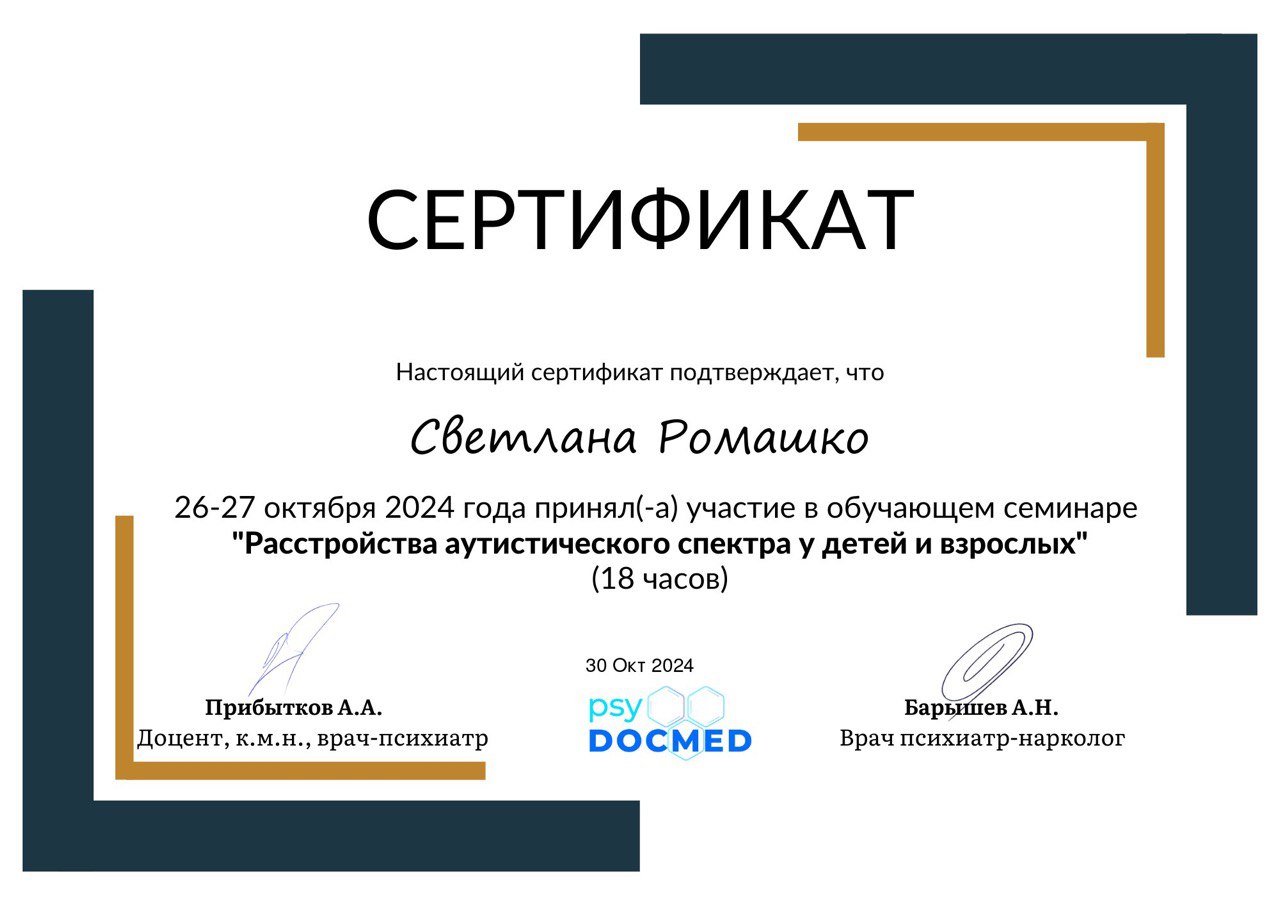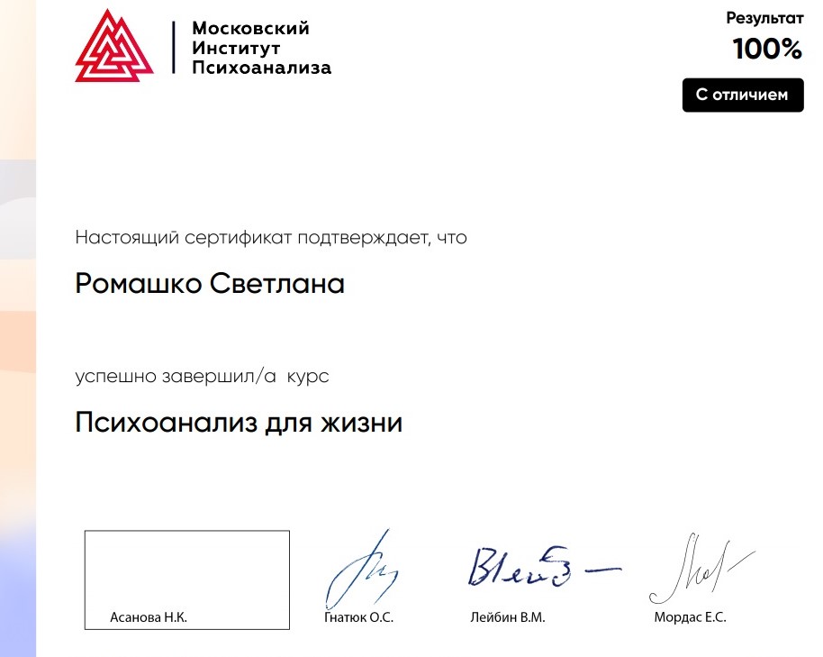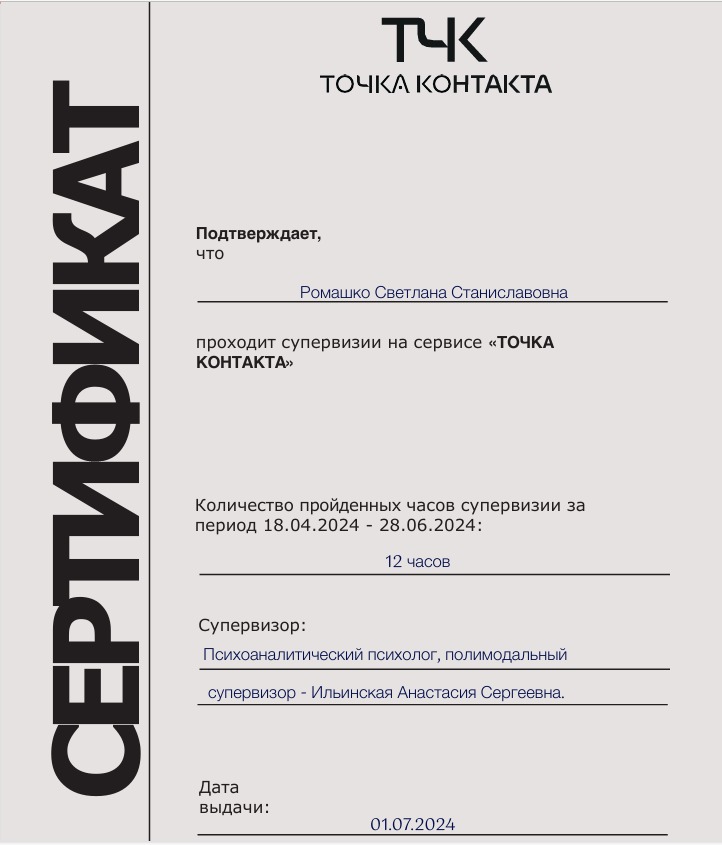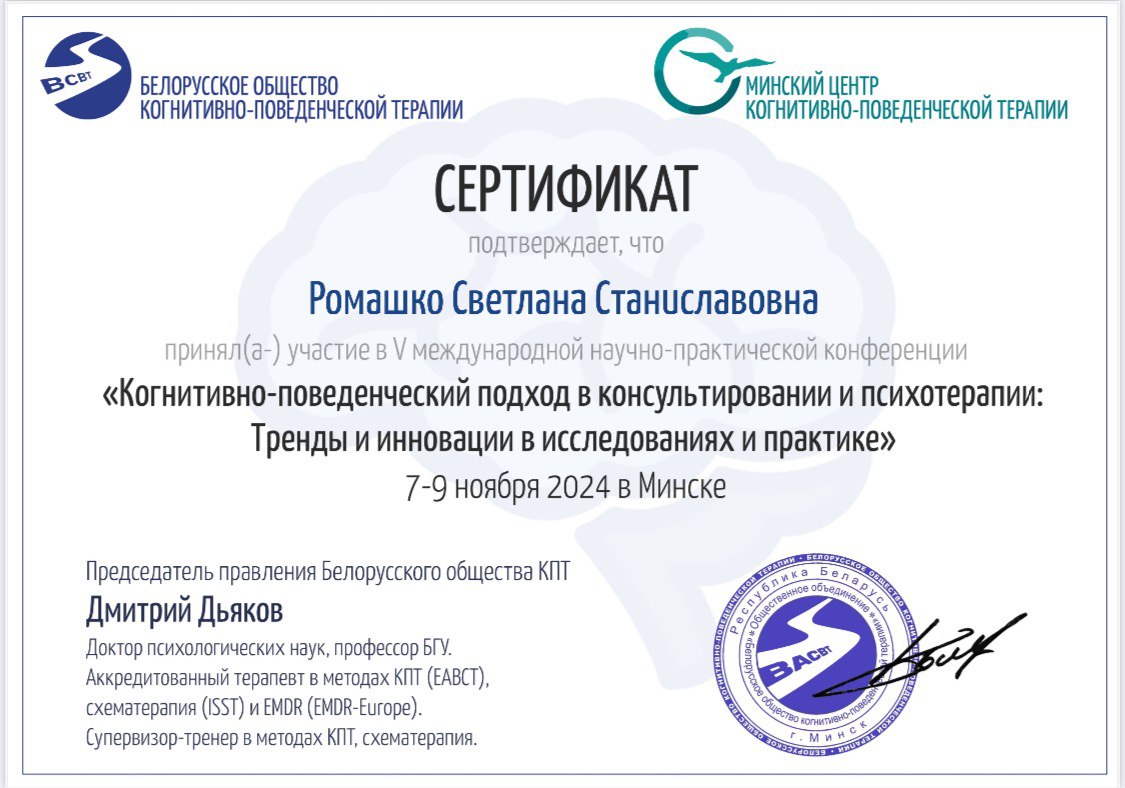 Хотел бы искренне поблагодарить своего психолога Ромашко Светлану Станиславовну за проделанную работу и глубокий подход к решению моих внутренних проблем. Когда я обратился, меня сильно беспокоили несколько проблем, чувство вины, постоянные размышления о прошлом, об упущенном времени и неудовлетворенность текущим положением дел, всё это мешало полноценно наслаждаться жизнью и двигаться вперёд.