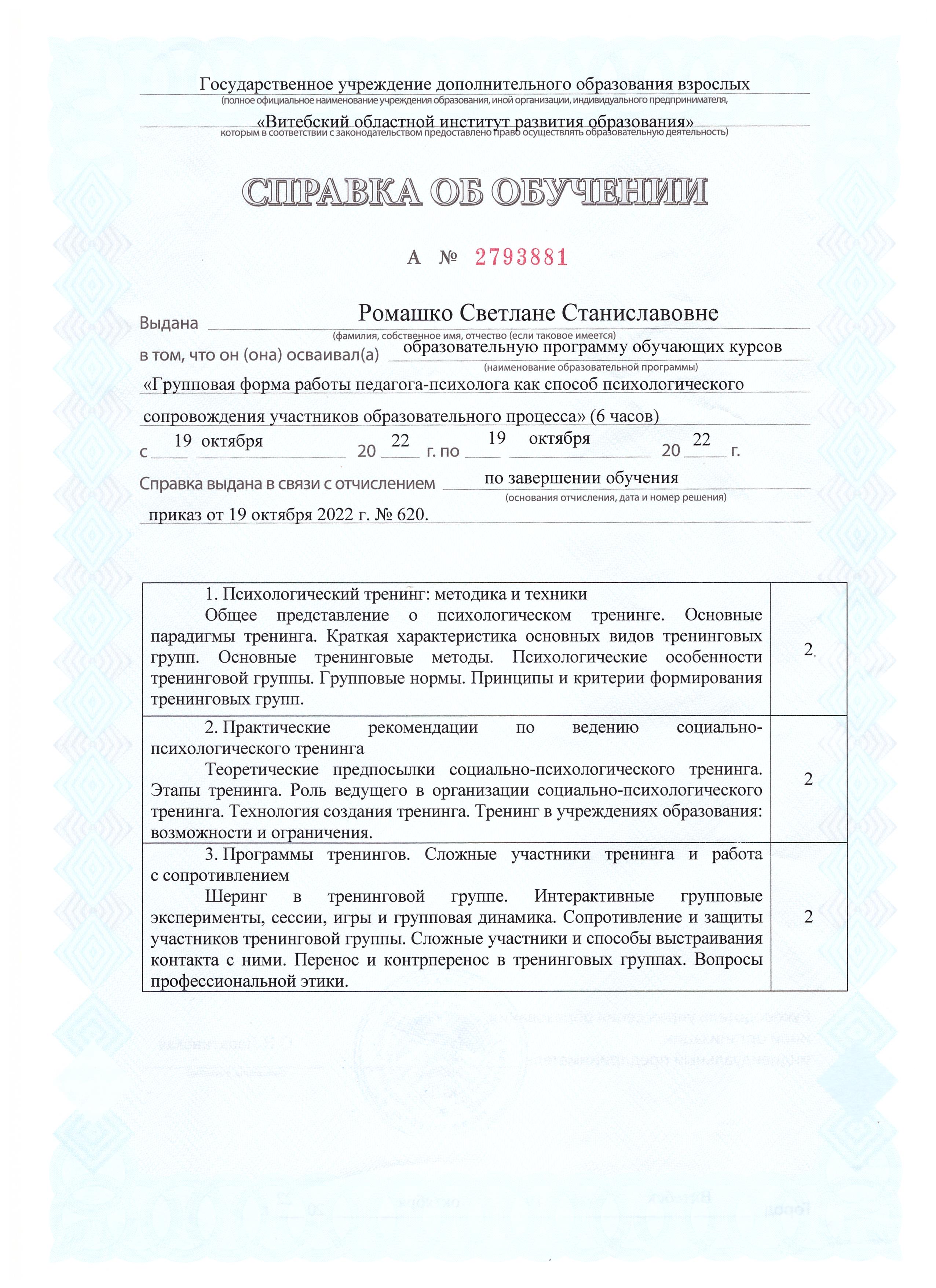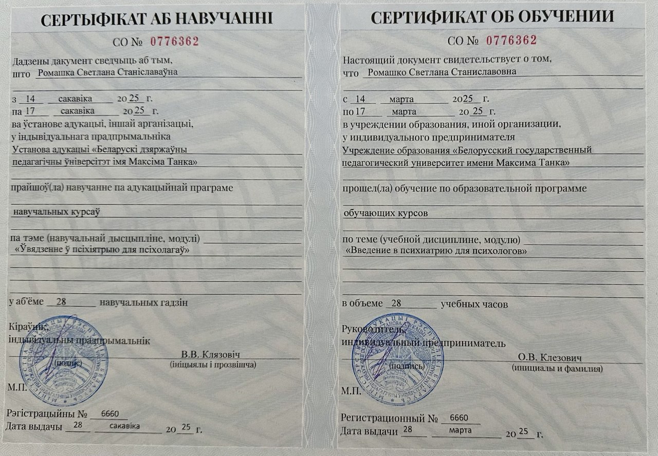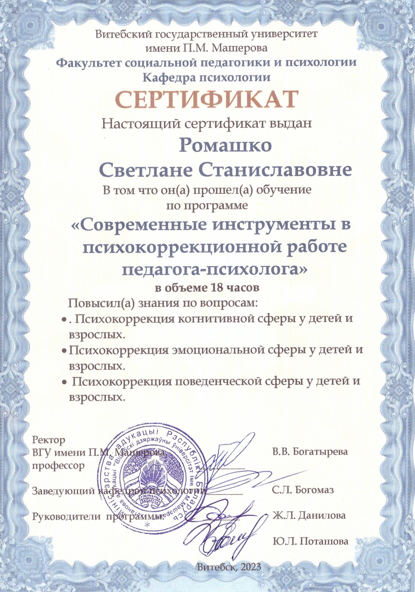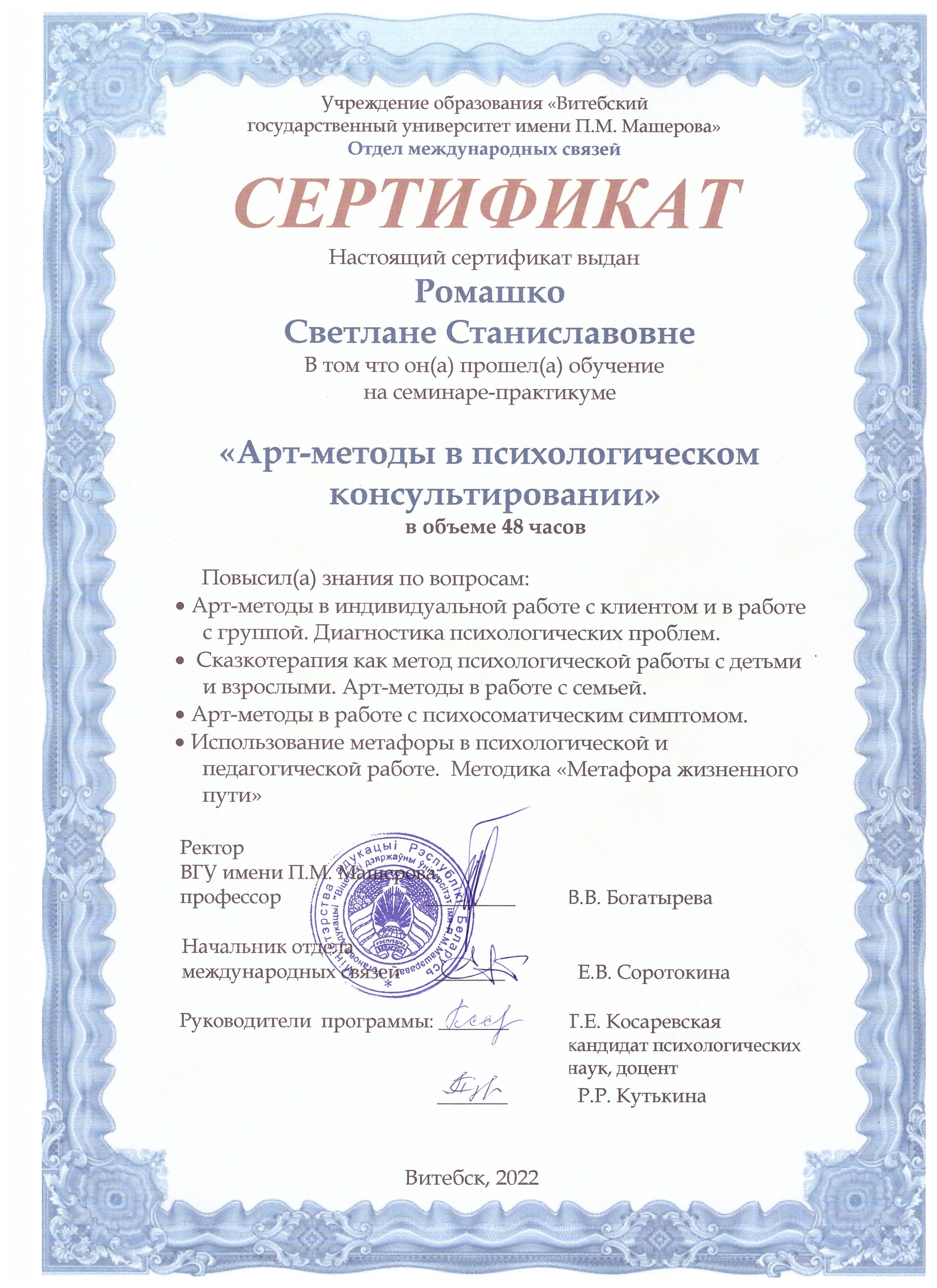 Хотел бы искренне поблагодарить своего психолога Ромашко Светлану Станиславовну за проделанную работу и глубокий подход к решению моих внутренних проблем. Когда я обратился, меня сильно беспокоили несколько проблем, чувство вины, постоянные размышления о прошлом, об упущенном времени и неудовлетворенность текущим положением дел, всё это мешало полноценно наслаждаться жизнью и двигаться вперёд.