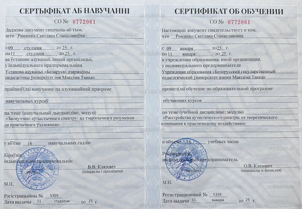 Работала педагогом-психологом в ГУО ЦКРОиР Полоцкого района (Центр коррекционно-развивающего обучения и реабилитации). Проводила диагностику детей в составе ПМПК и занятия с детьми с расстройством аутистического спектра (РАС, аутизм), СДВГ и другими диагнозами.