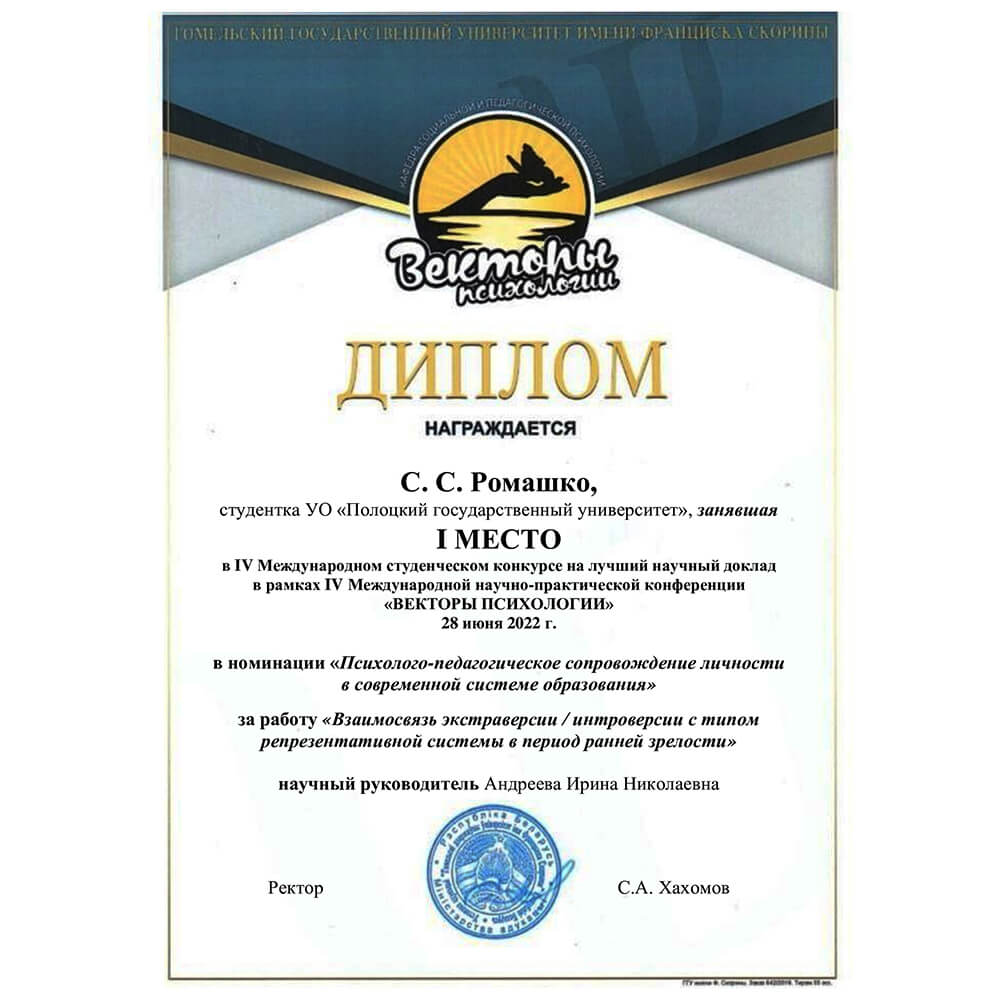 - Получила Диплом 1 место по теме своего исследования на лучший научный доклад в рамках IV Международной научно-практической конференции «ВЕКТОРЫ ПСИХОЛОГИИ».