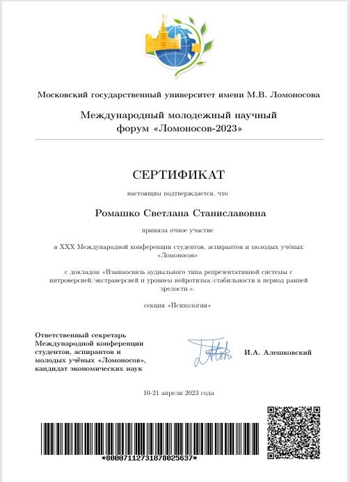 - Принимала очное участие с научным докладом в Московском государственном университете имени М.В. Ломоносова в рамках XXX Международной конференции студентов, аспирантов и молодых учёных «Ломоносов». В секции "Психология личности: вызовы, сложности, неопределённости и разнообразия.