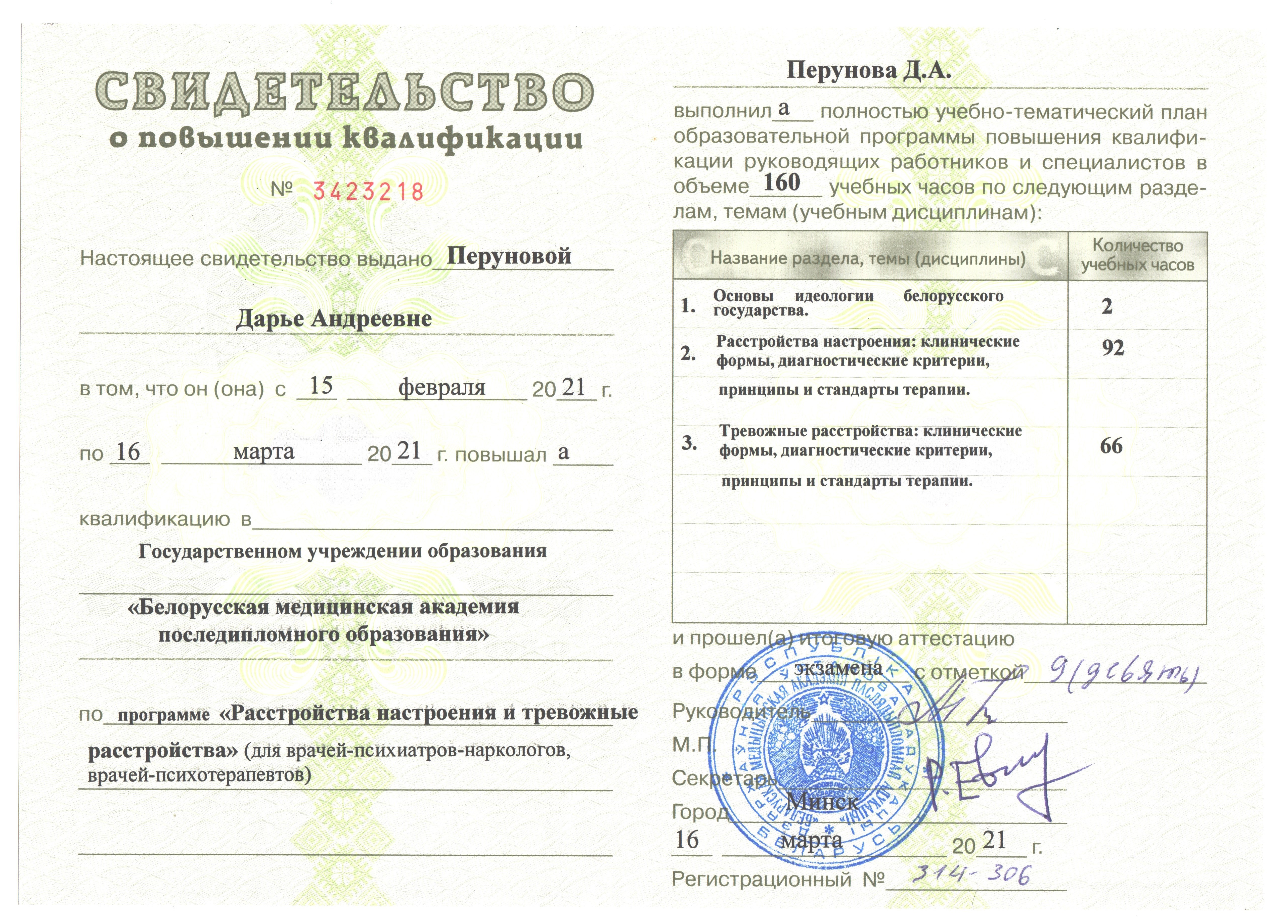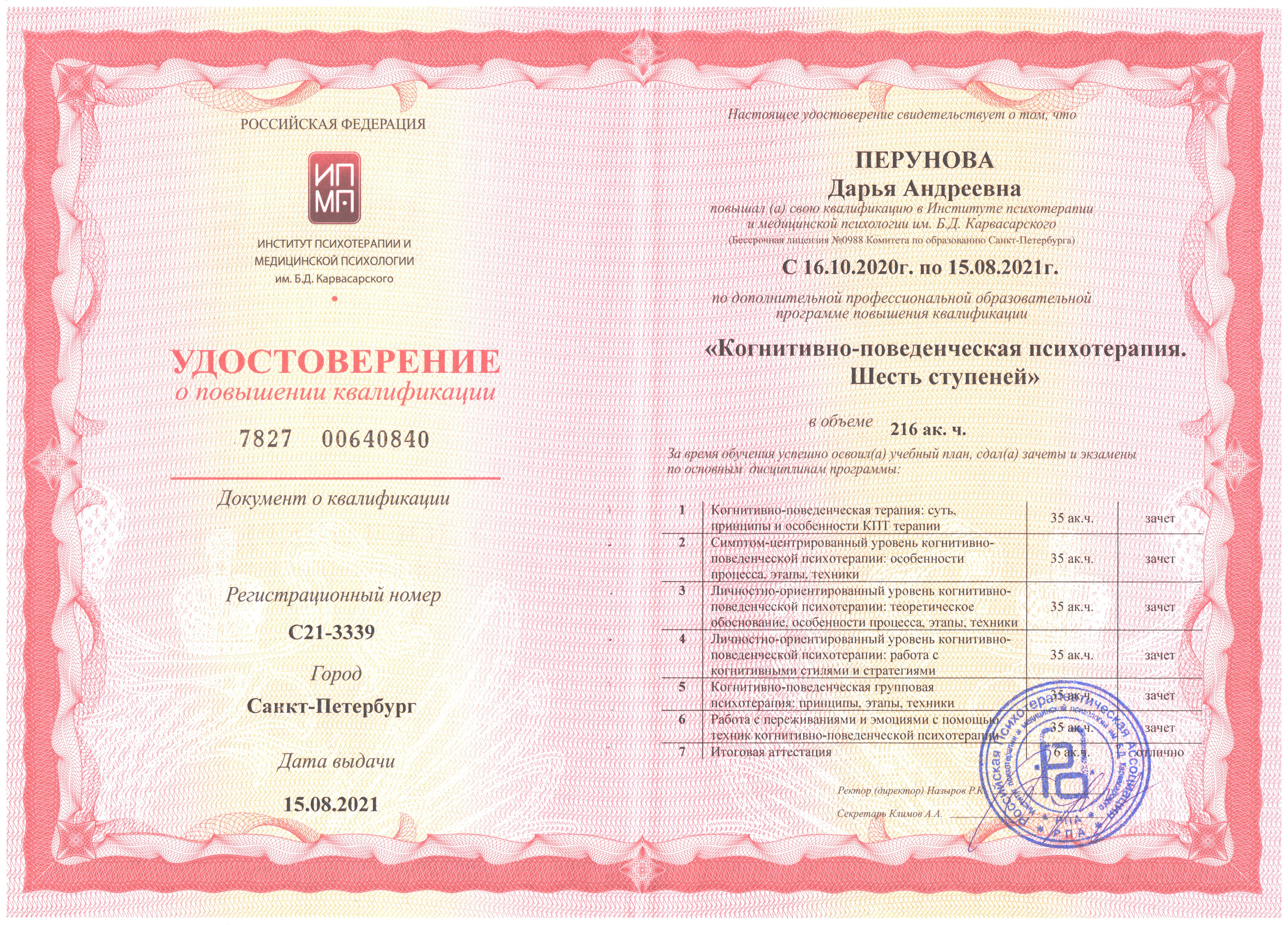 С раннего возраста я интересуюсь феноменами психики, отношениями человека с собой и миром. Поэтому, окончив медицинский университет, я выбрала специальность психиатрия и наркология. В своей работе я ориентируюсь на чувства и потребности человека. Я эмпатичный, бережный и внимательный терапевт. Готова разделить с вами страхи, сомнения, тревогу.