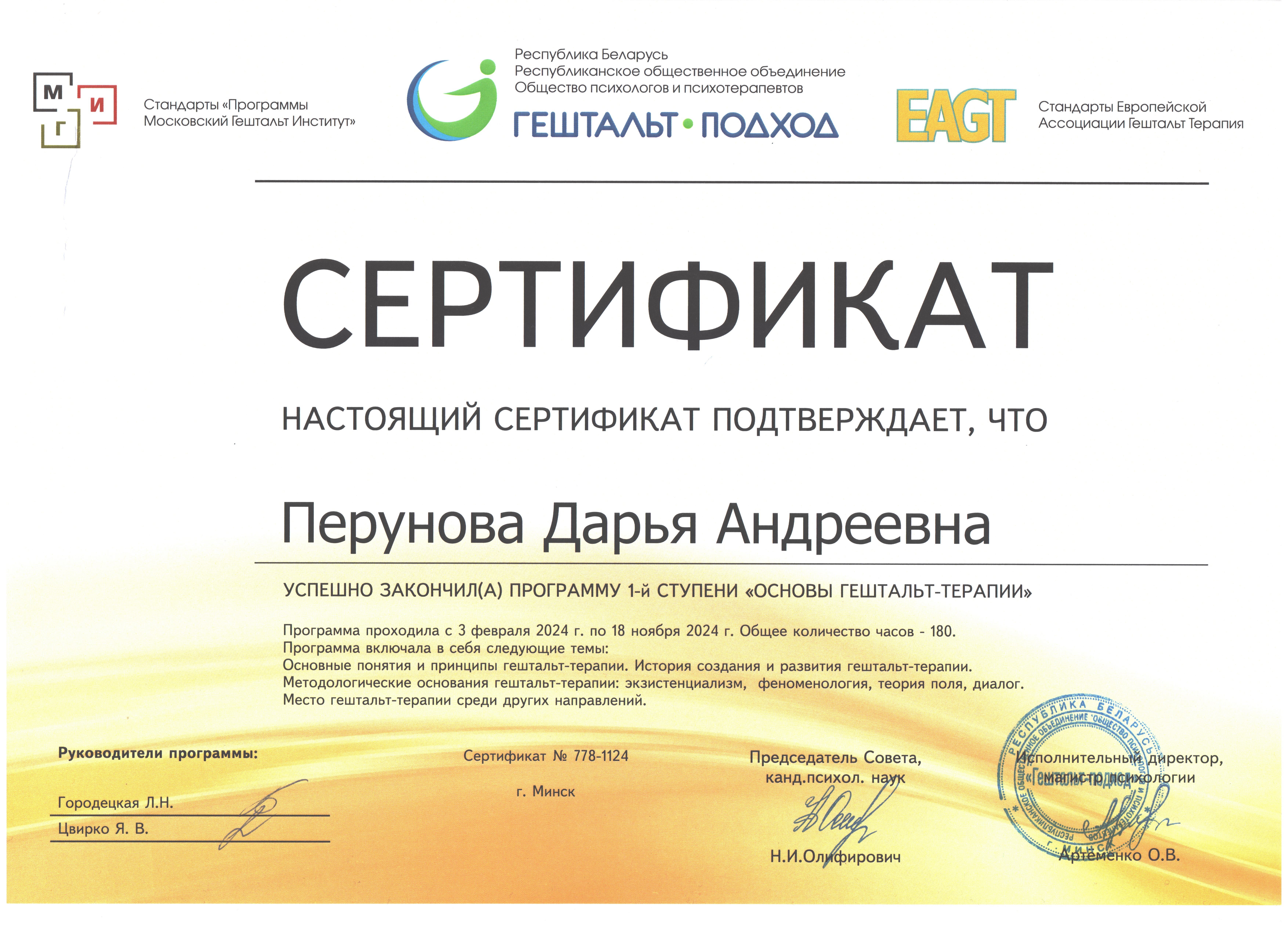 В своей работе я опираюсь на гештальт-подход и техники когнитивно-поведенческой терапии. Постоянно учусь и повышаю свою квалификацию. Буду рада помочь вам, будь это знакомство с собой или поддержка в кризисный моменты.