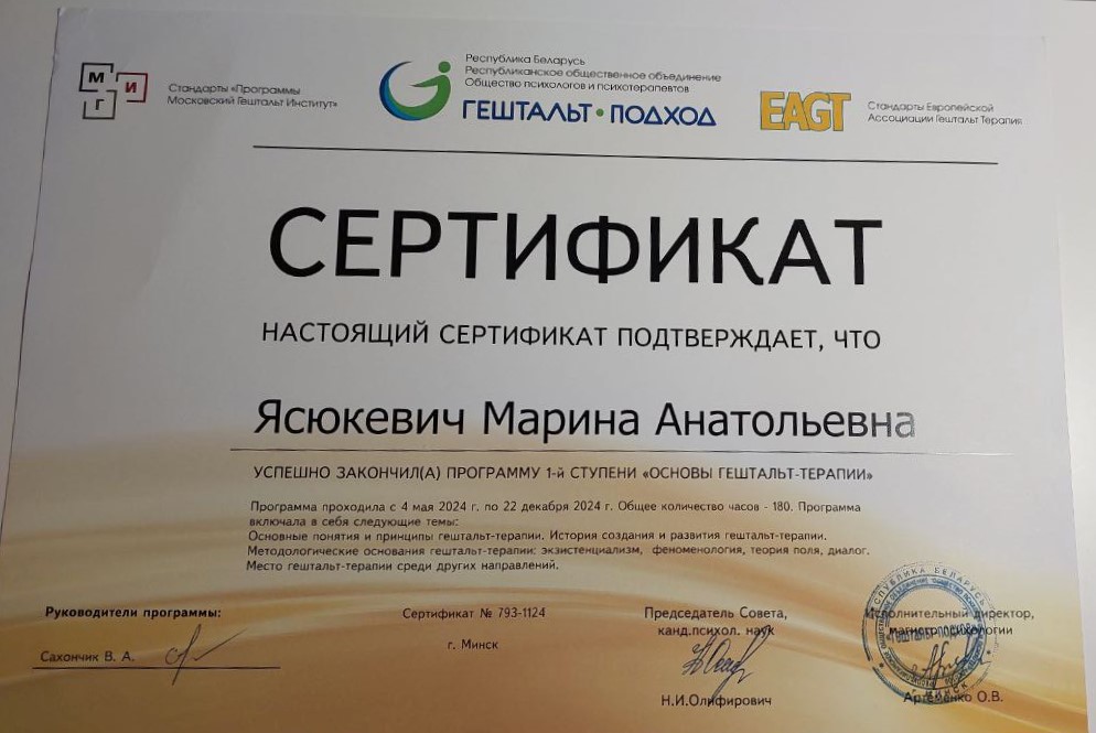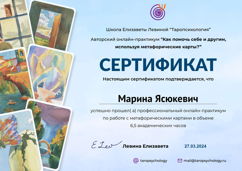 Здравствуйте! Меня зовут Марина, я дипломированный психолог с 12-летним опытом работы. В своей практике опираюсь на гештальт подход, а также использую техники символдрамы, арт-терапии и метафорические ассоциативные карты, что позволяет глубоко понять ваши внутренние процессы и найти индивидуальные решения.Я помогу вам преодолеть личностные кризисы, справиться со сложными жизненными ситуациями и наладить гармонию в отношениях. Я создаю безопасное пространство для открытого диалога, слушаю и поддерживаю вас на пути к внутренней гармонии, личностному росту и улучшению качества жизни.Если вы чувствуете необходимость разобраться в себе, изменить сложные ситуации или просто хотите лучше понять свои чувства и потребности — я готова помочь вам обратиться к вашим внутренним ресурсам и найти путь к гармонии и самореализации.
