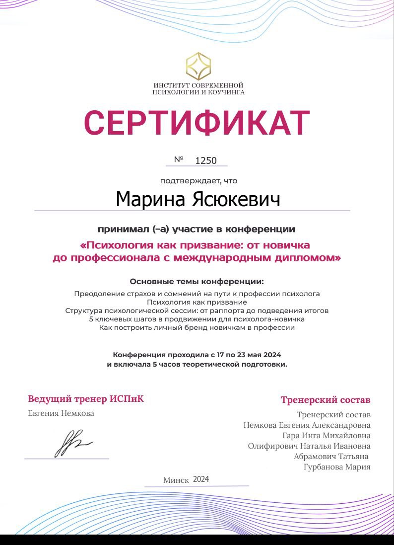 Марина, выражаю вам огромную благодарность за проделанную работу и профессионализм. Я научилась лучше понимать себя и справляться со своими эмоциями. После нескольких месяцев консультаций я стала уверенной в себе, открытой к общению и научилась выстраивать здоровые отношения с окружающими меня людьми!