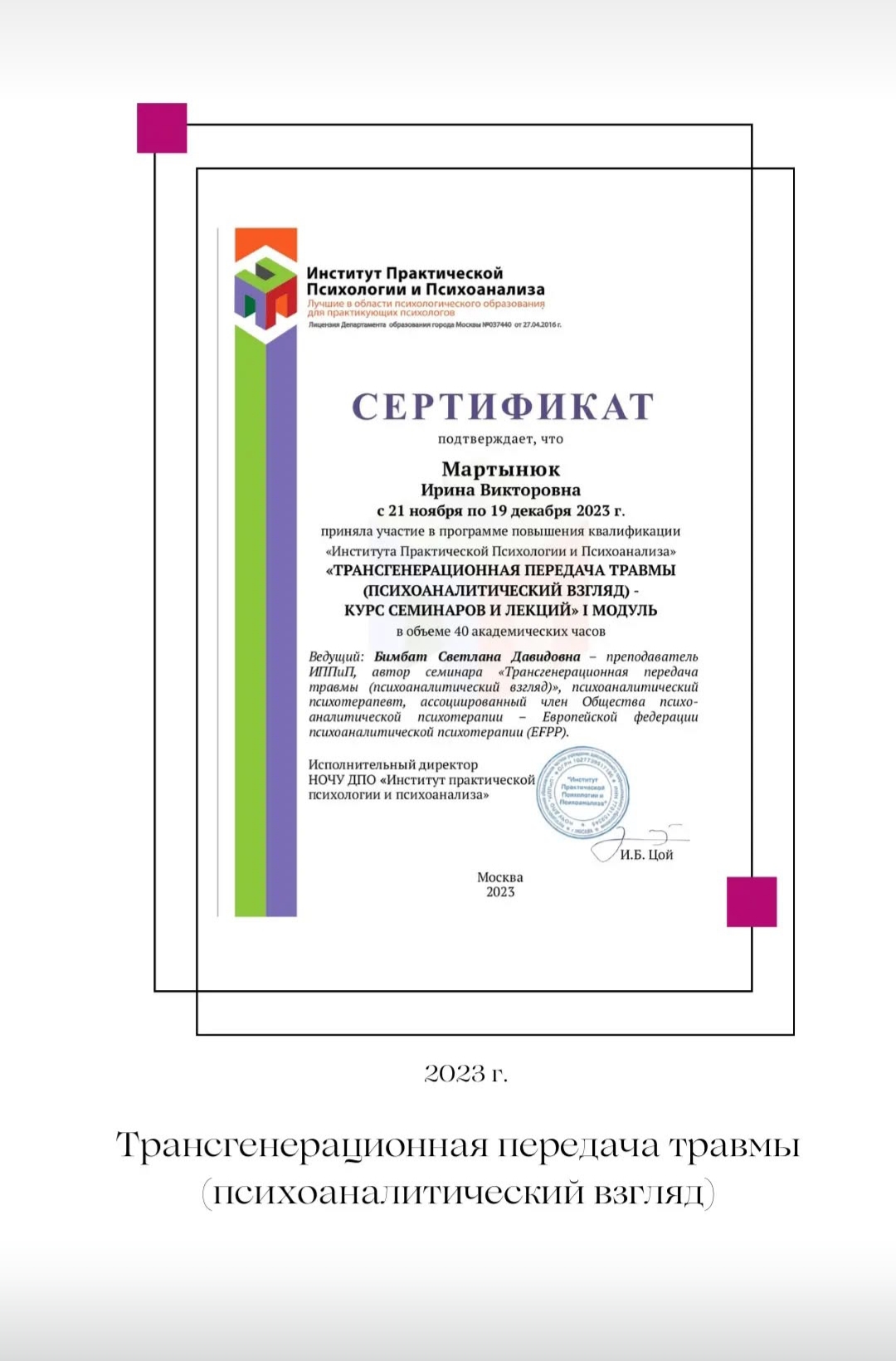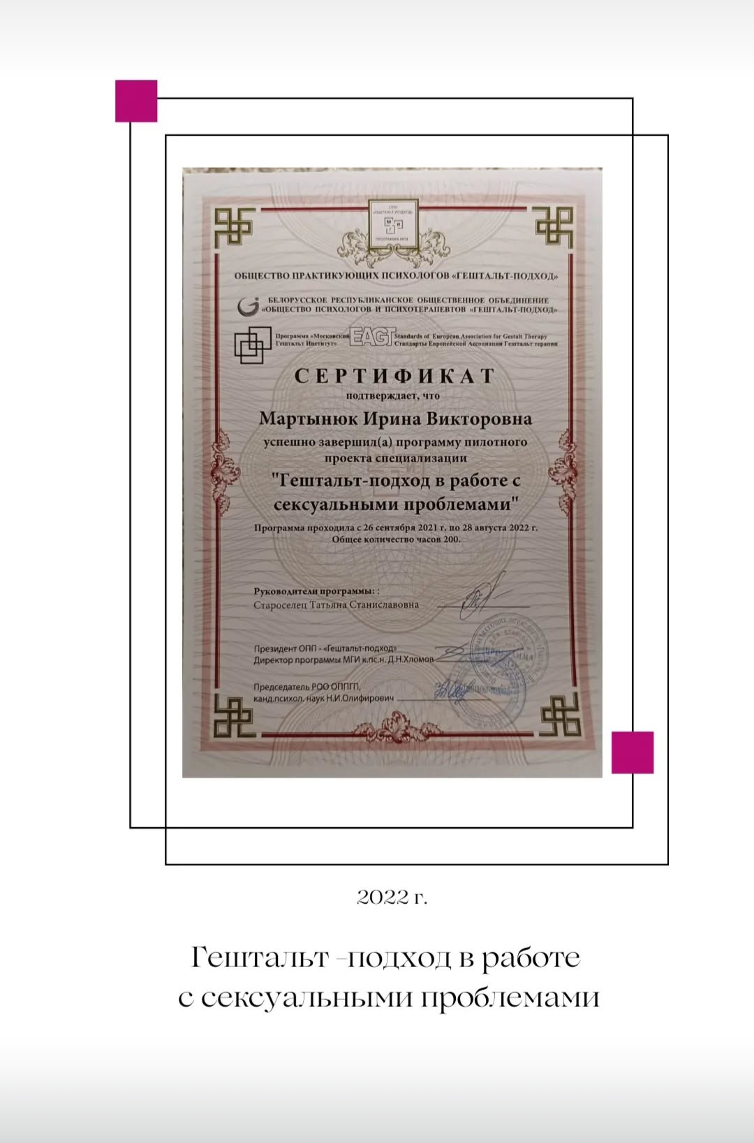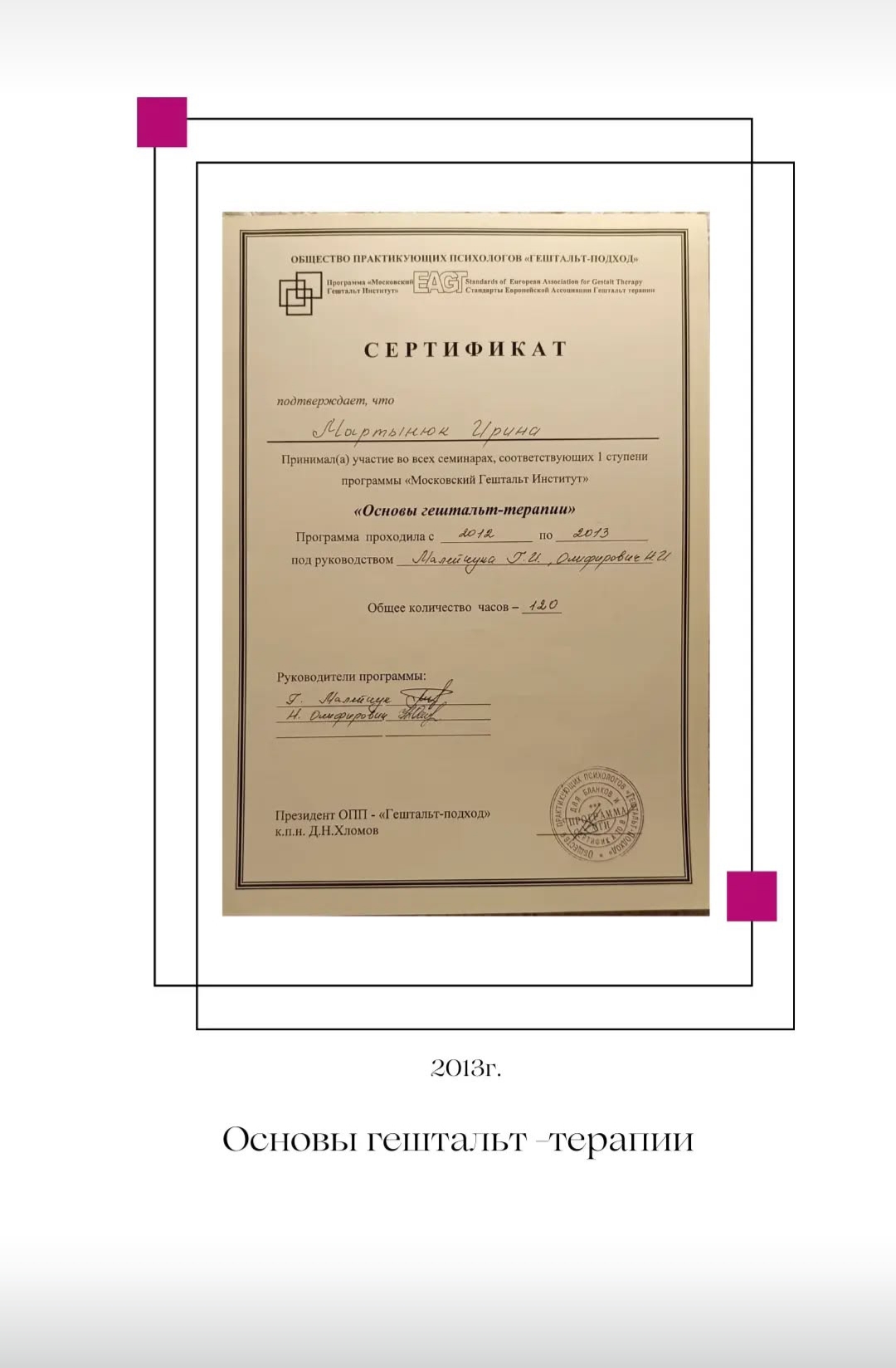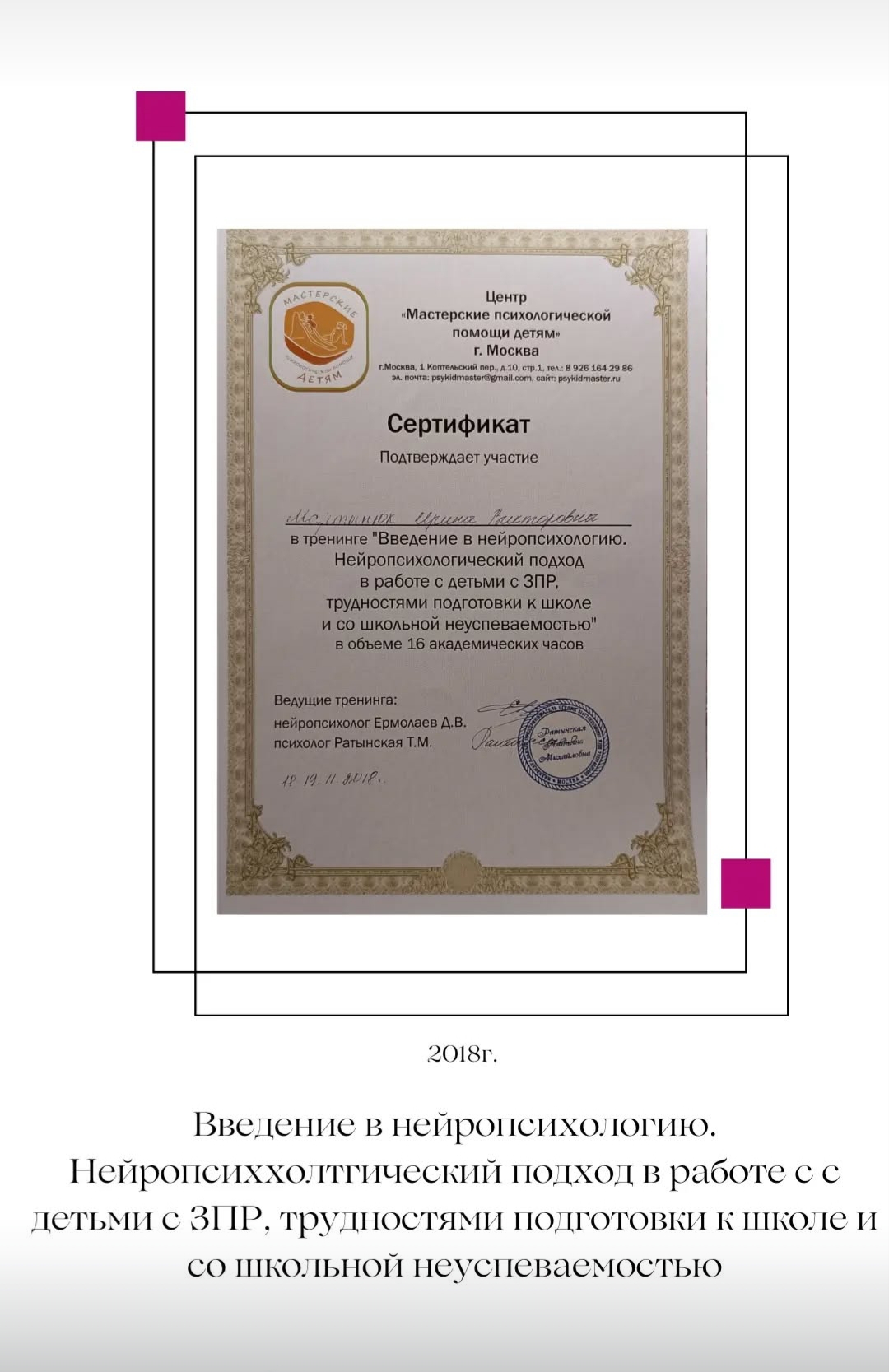 Я постоянно повышаю свой профессиональный уровень, прохожу индивидуальную терапию и супервизию.