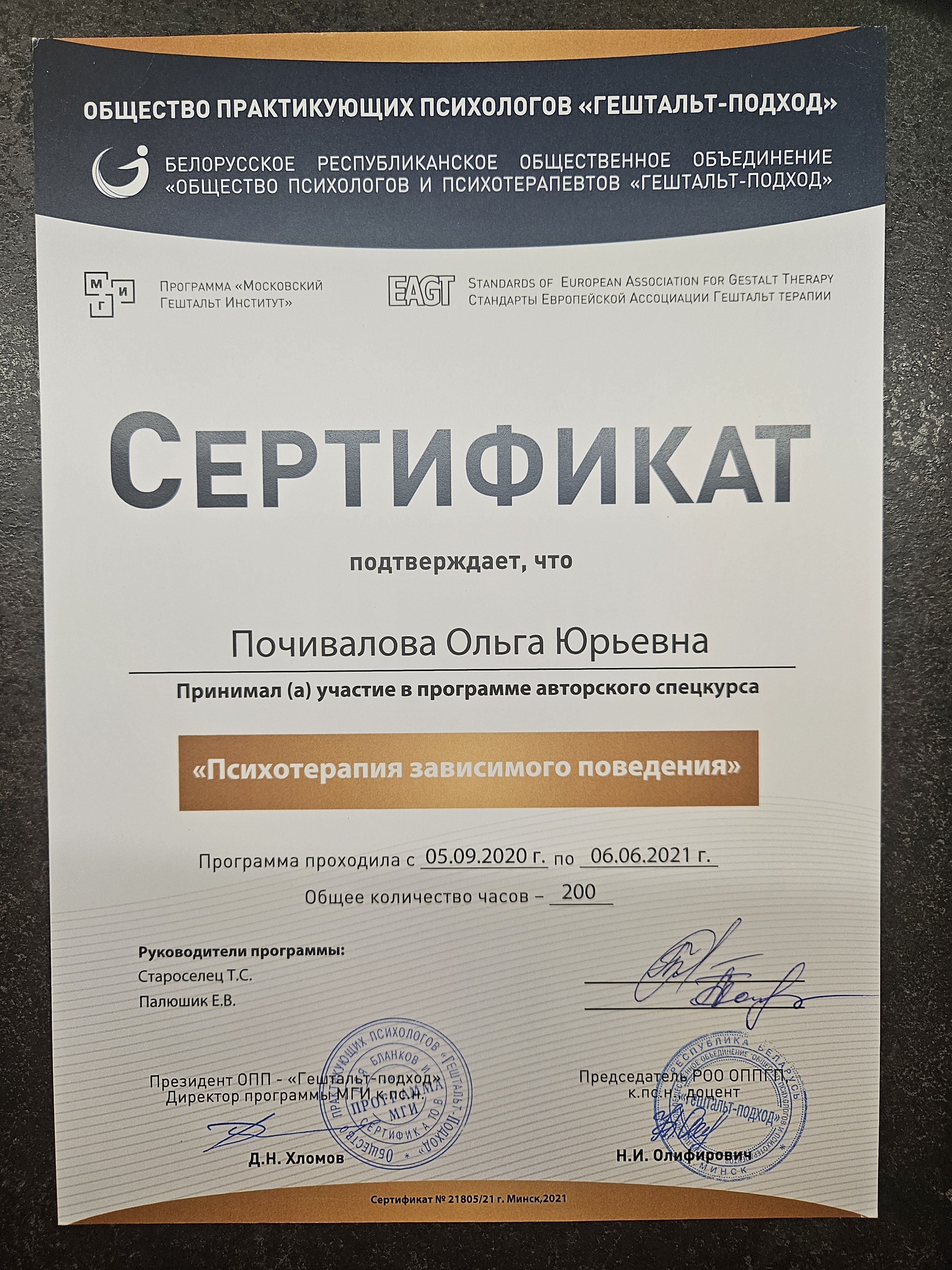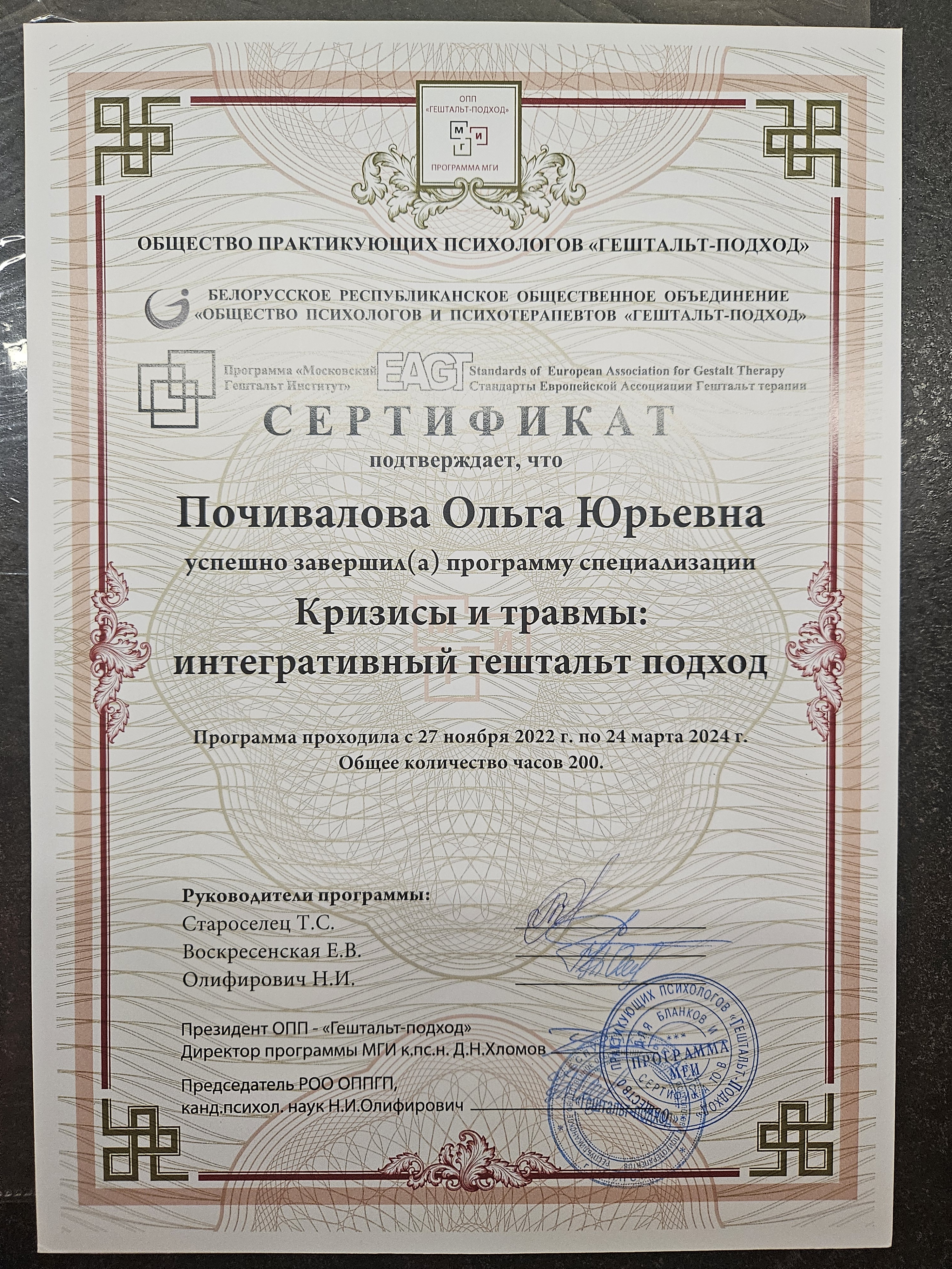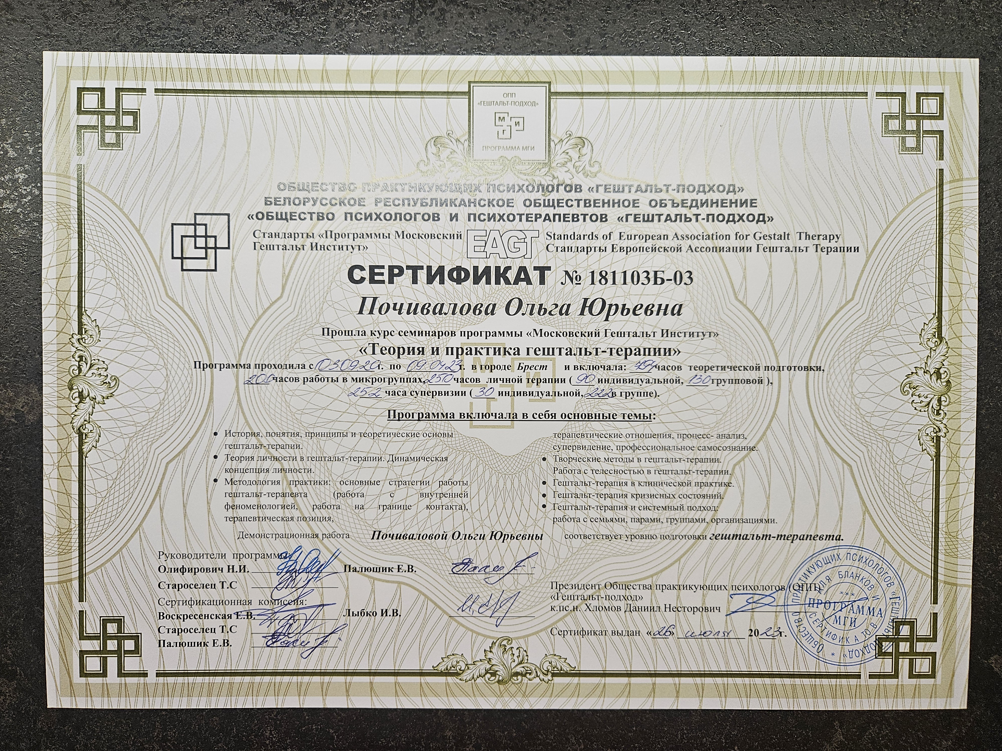 Сертифицированный и аккредитованный гештальт-терапевт. В работе использую интегративный подход - применяю знания и техники из других направлений психотерапии.Готова вместе с вами изучать и углубляться в ваш внутренний мир и представления об окружающем.