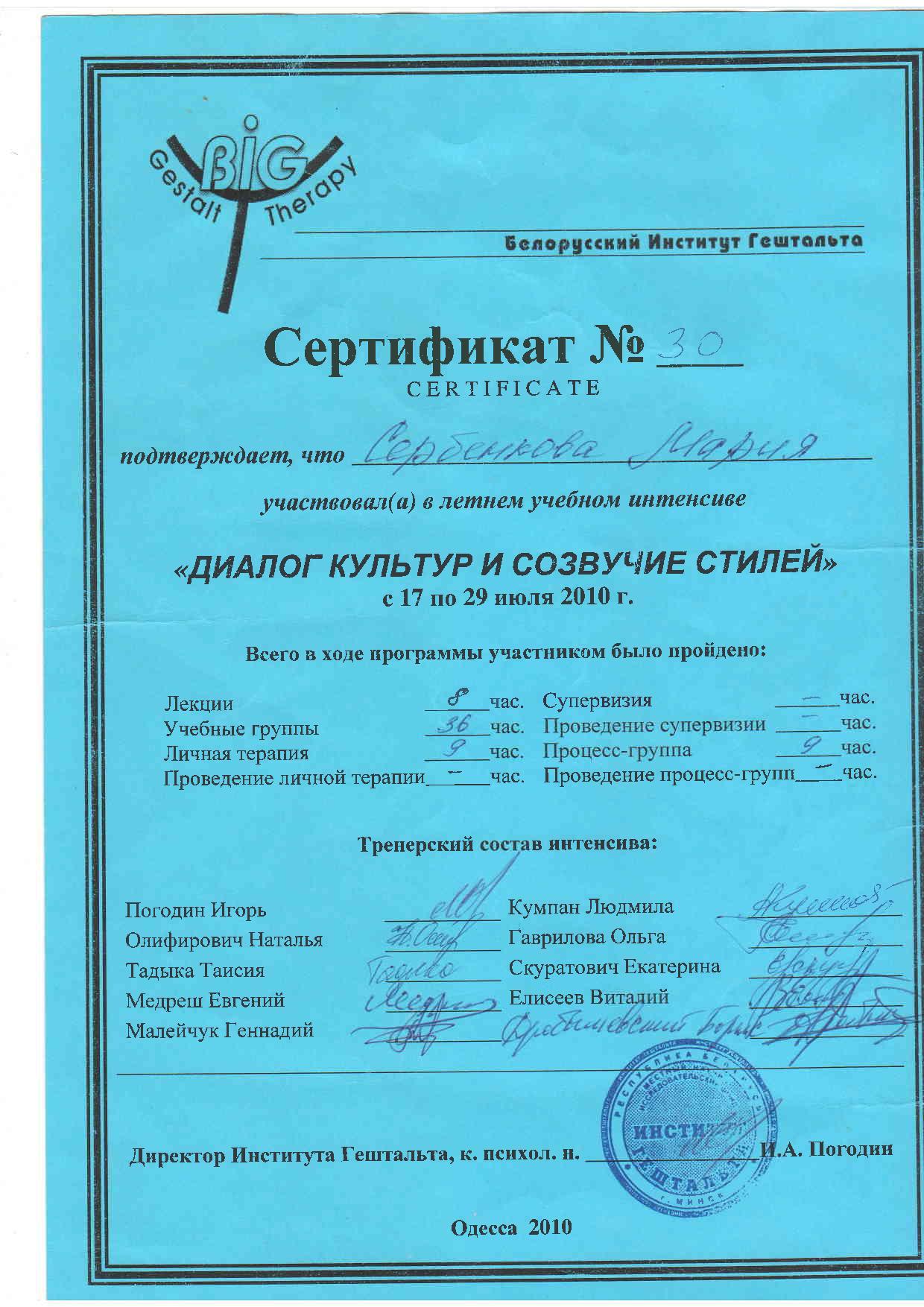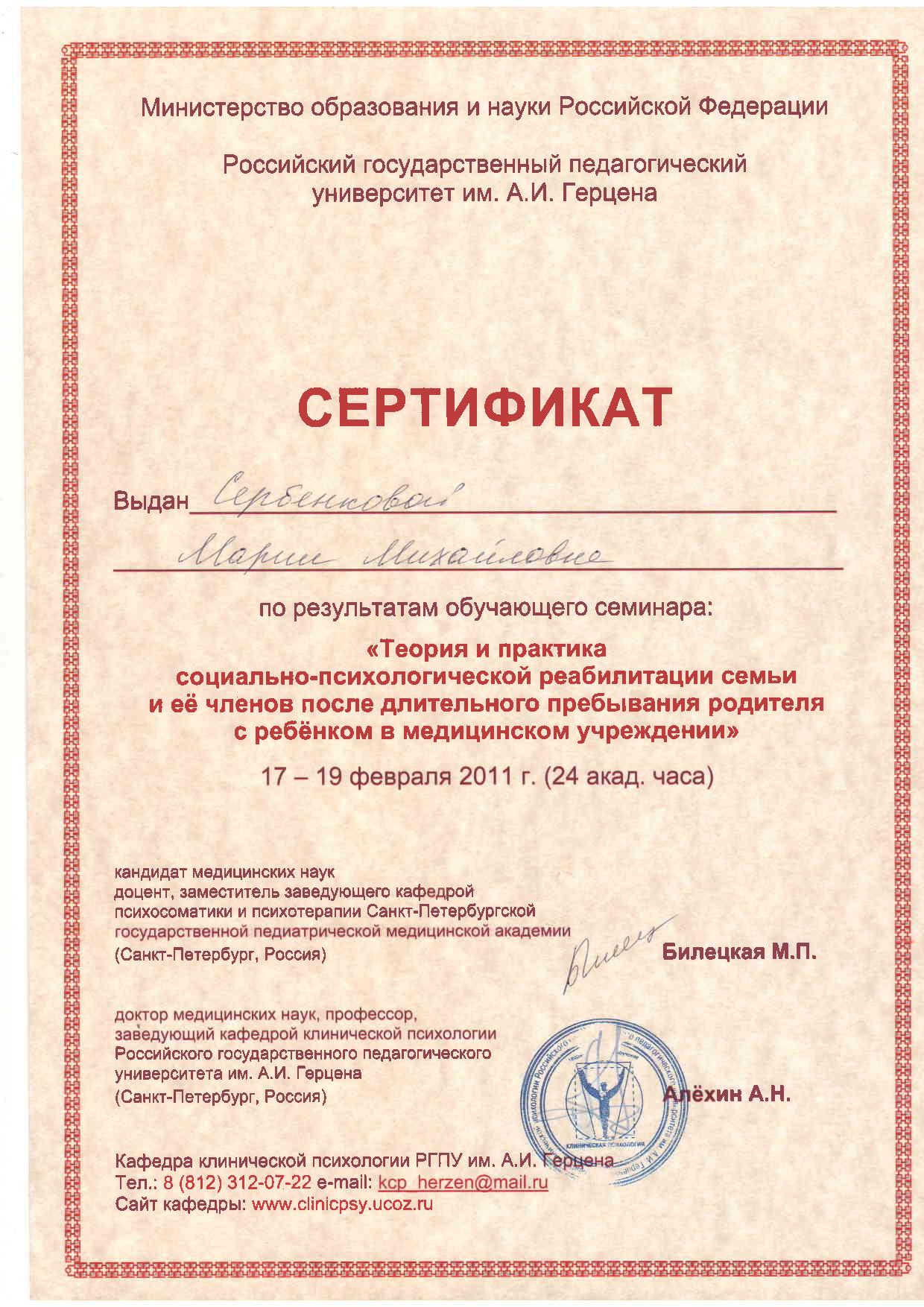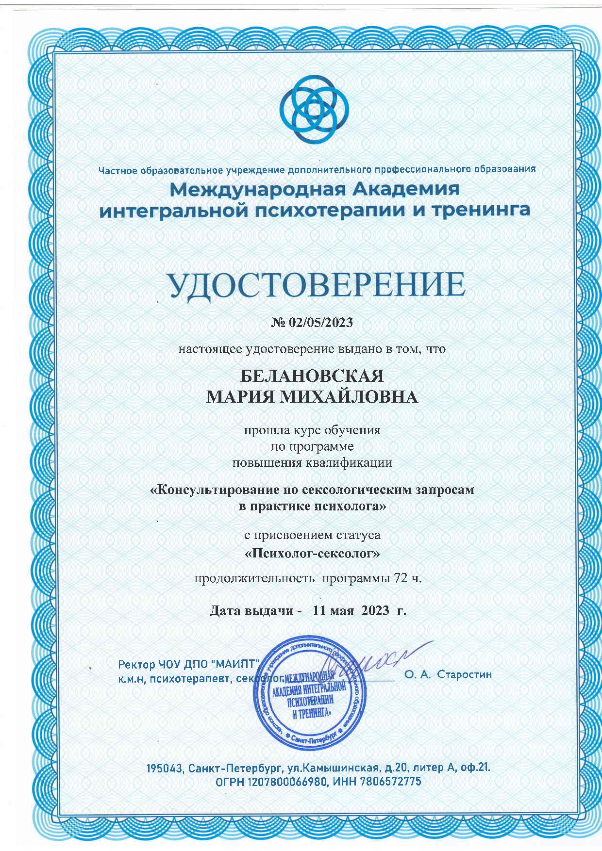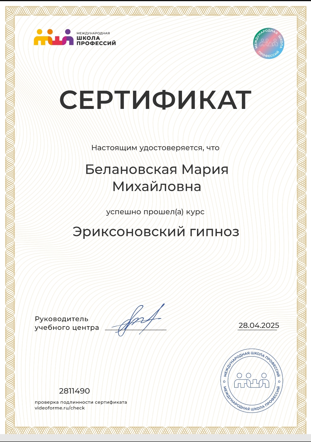 Гипнотерапевт в клинической психологии. Окончила международную школу эриксоновского гипноза в клинической психологии. Санкт-Петербург, Россия