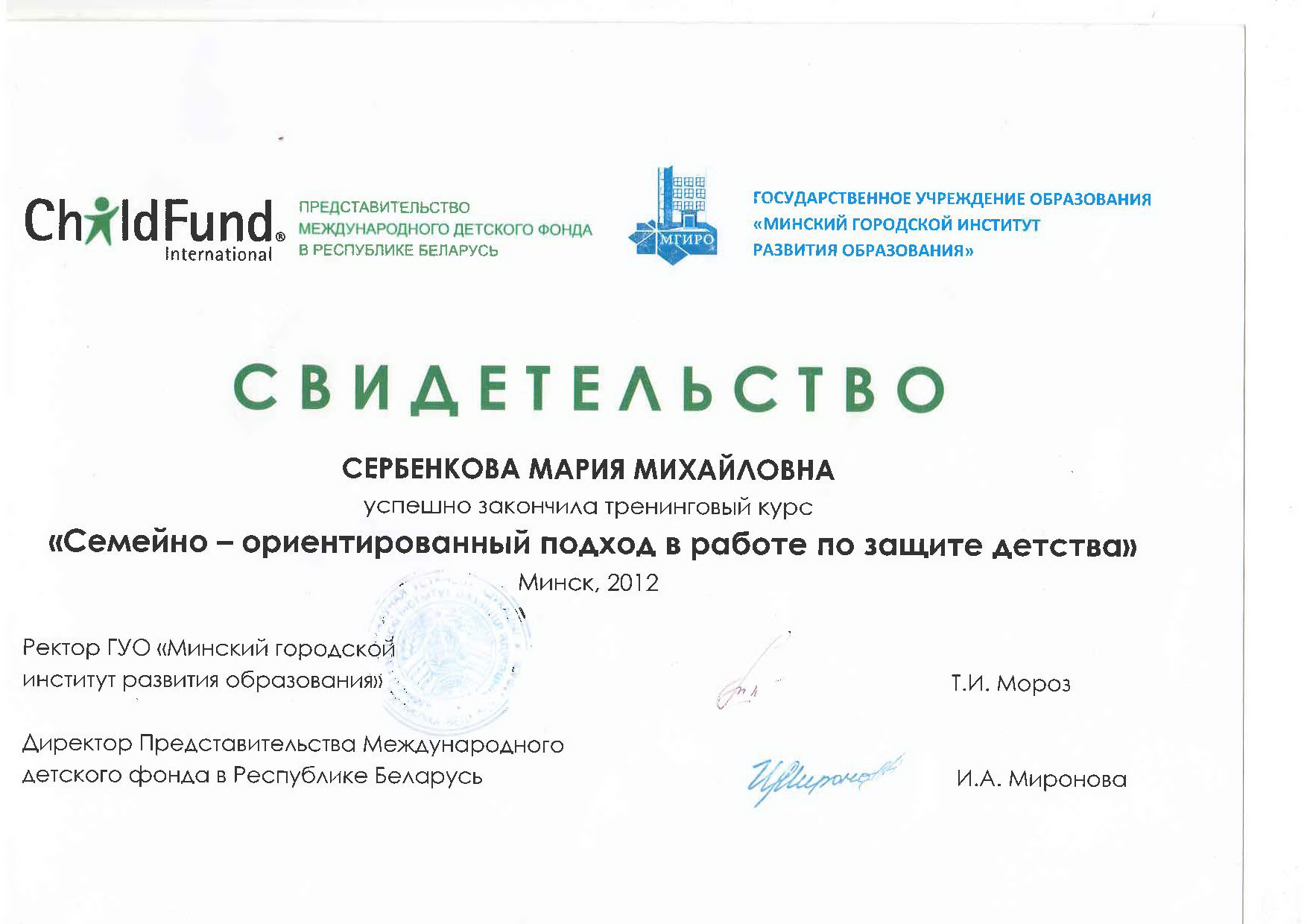 Официальный представитель UNICEF и международного детского фонда Chilfond в области системы защиты детства и стабилизации различных детских/подростковых психо-эмоциональных состояний;