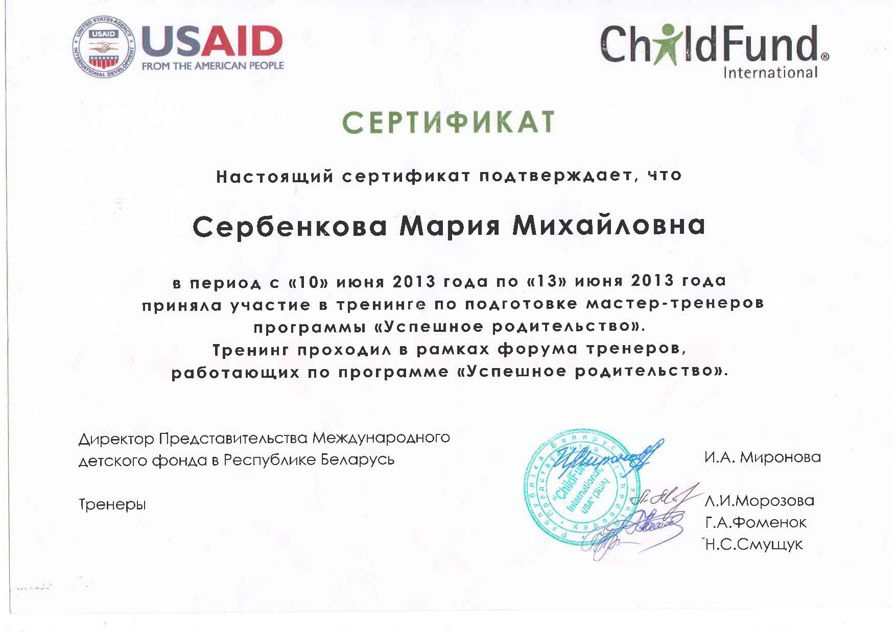 Официальный представителем программ USAID по работе с семьями и людьми оказавшимися в трудных жизненных ситуациях, в состояниях ПТСР, кризисов или стрессов, переживших насилие и другие травматические ситуации;